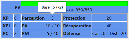 Des bonus / malus de perception peuvent être donnés en fonction du terrain sur lequel vous vous trouvez directement, par exemple, un malus de 2 points lorsqu'on se trouve en forêt (mais offre un bonus de defense aux attaques aux armes à ditance de 20) :