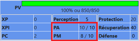 Chaque personnage que vous controllez possède un certain nombre de PA (points d'actions) que vous pouvez dépenser pour différentes actions (attaques, constructions, réparations, soins, achats, consommation d'un objet, équippement d'une arme, etc...) durant votre tour de jeu.