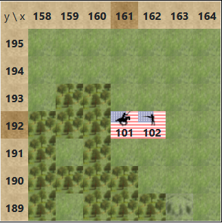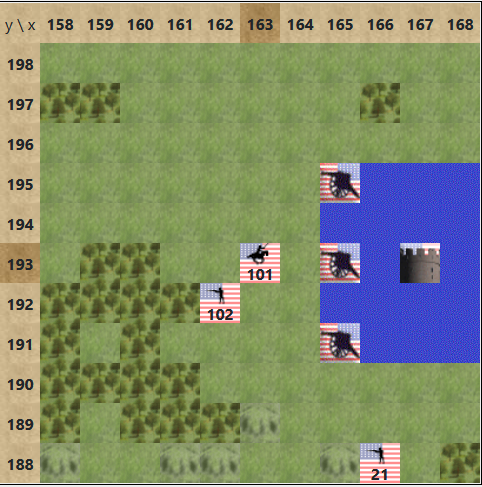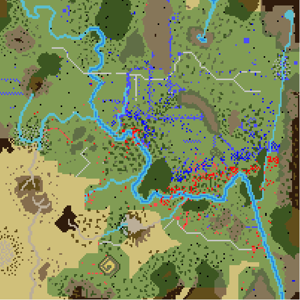 Certaines parties sont comme vous pouvez le voir sous une forme de brouillard de guerre, ce sont les parties de la carte que votre camp n'a pas encore exploré. En Bleu se trouve les persos (en bleu foncé) et les infrastrctures (en bleu plus clair) du camp Nord et en Rouge les persos et infrastructure du camp Sud. On peut aussi apercevoir un tracé gris clair entre certains batiments, ce sont des rails entre les gares où circulent les trains.